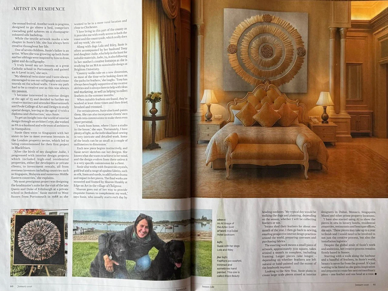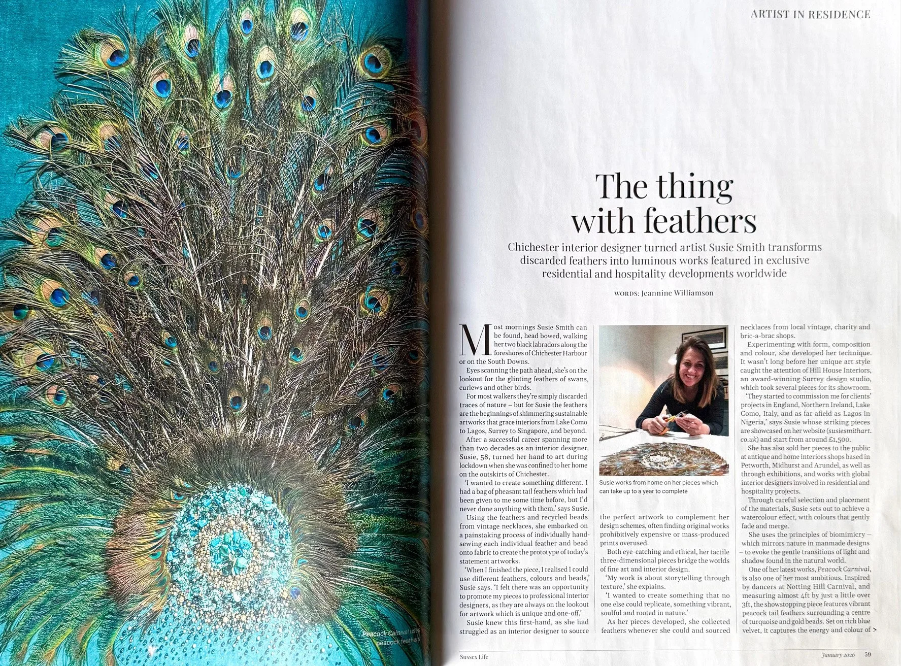Susie’s talents extend far beyond the world of interiors. Driven by a desire to create something tangible to enhance a space, she recently embarked on a new artistic venture, crafting unique works that combine feathers and hand-sewn beads. This new chapter in her creative life draws upon her love of textiles and sewing and are demonstrated in striking, one-of-a-kind pieces.