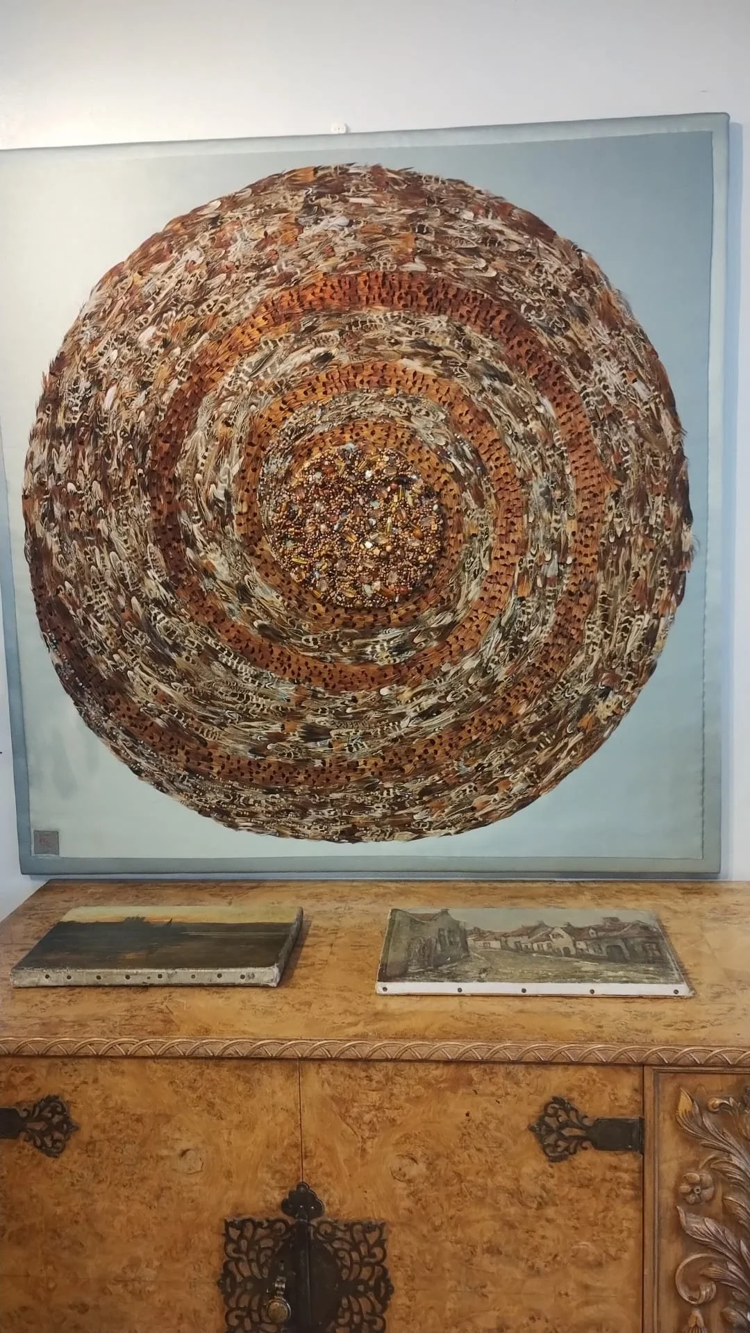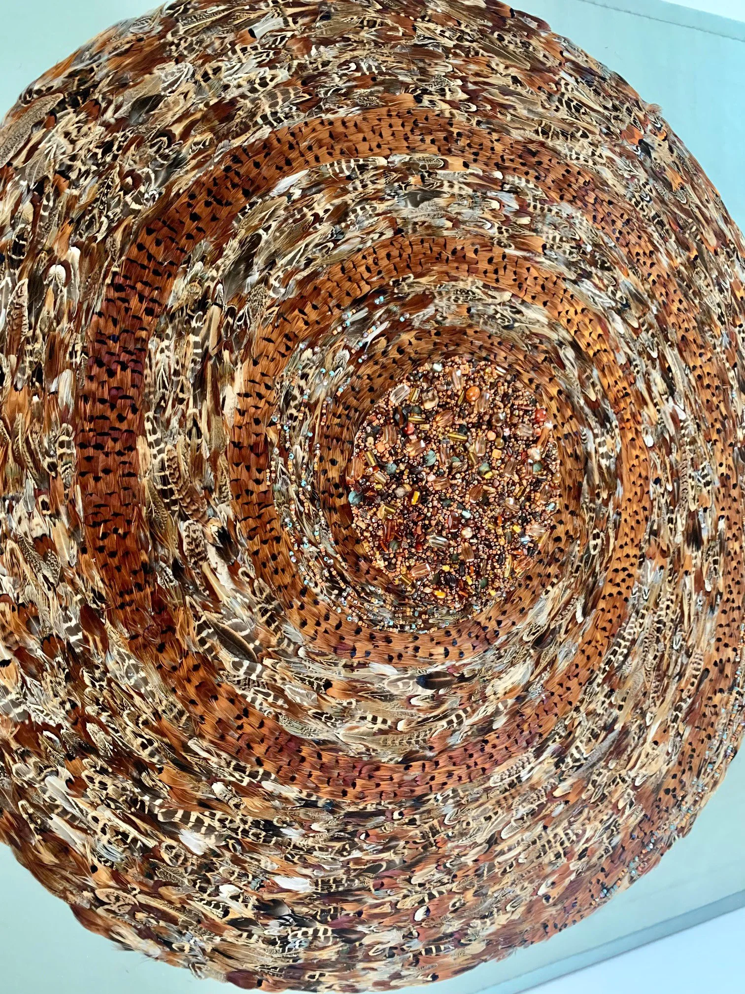 This piece showcases duck and pheasant feathers arranged in a precise circular form, drawing the eye inward to a centrepiece of vintage hand-sewn beads.