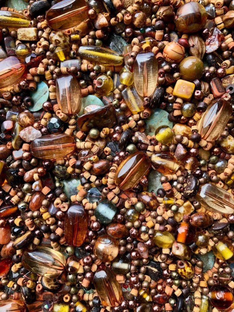 The contrast between organic materials and intricate beadwork creates a balanced, textural focal point.