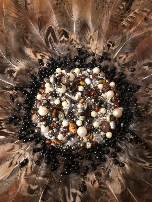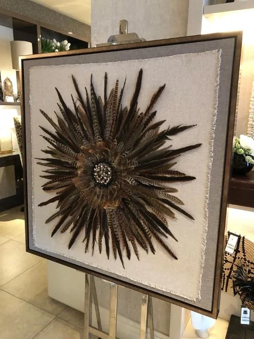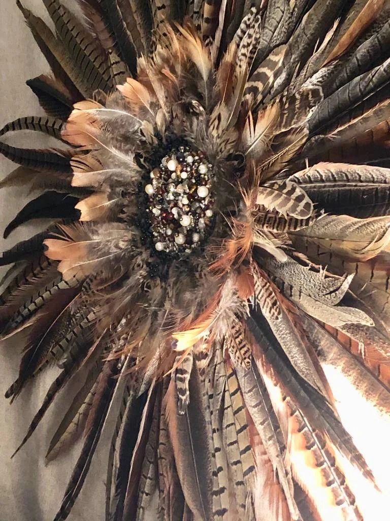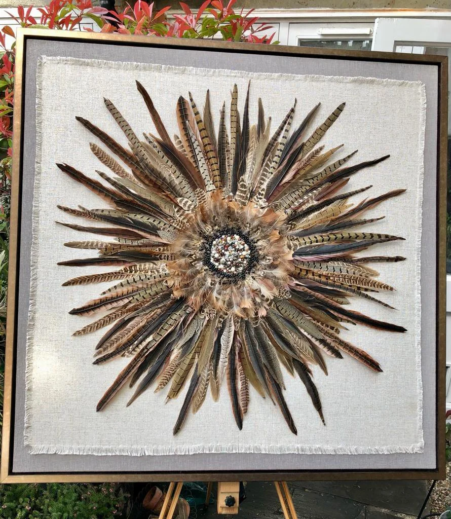 A country-inspired artwork crafted from pheasant and duck feathers, adorned with a central piece of vintage beadwork. The composition is double-mounted on beautiful neutral cotton fabric - the inner one slightly frayed - celebrating the textures, colours, and quiet elegance of the countryside.
