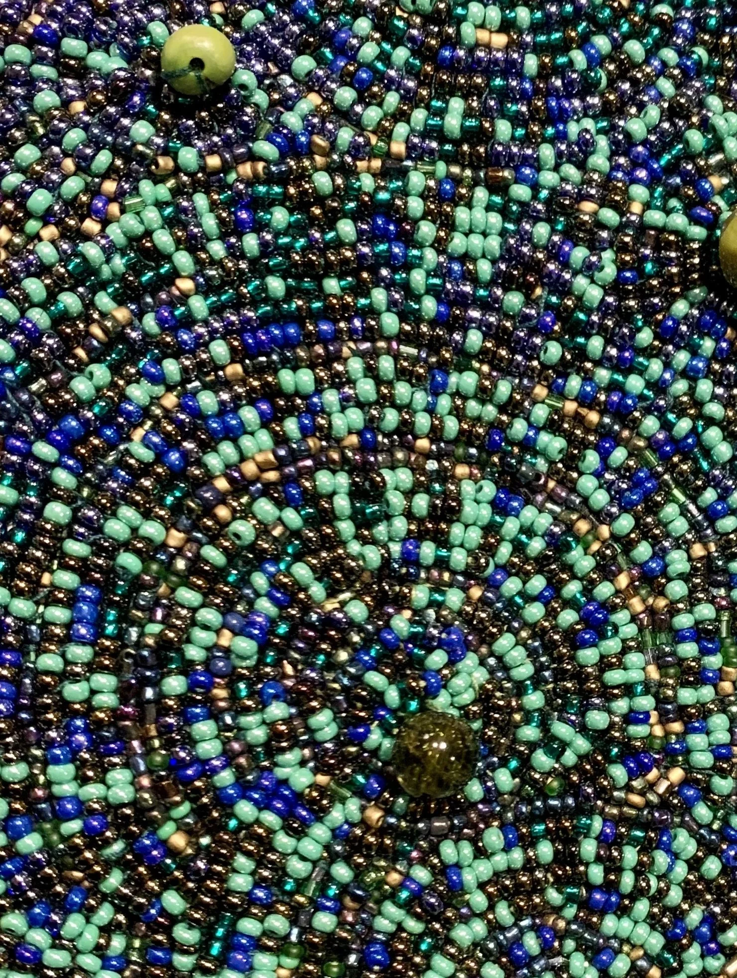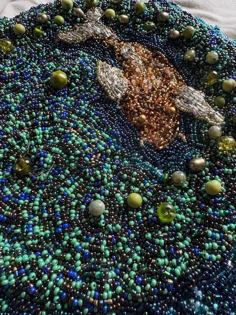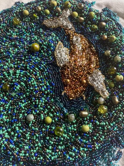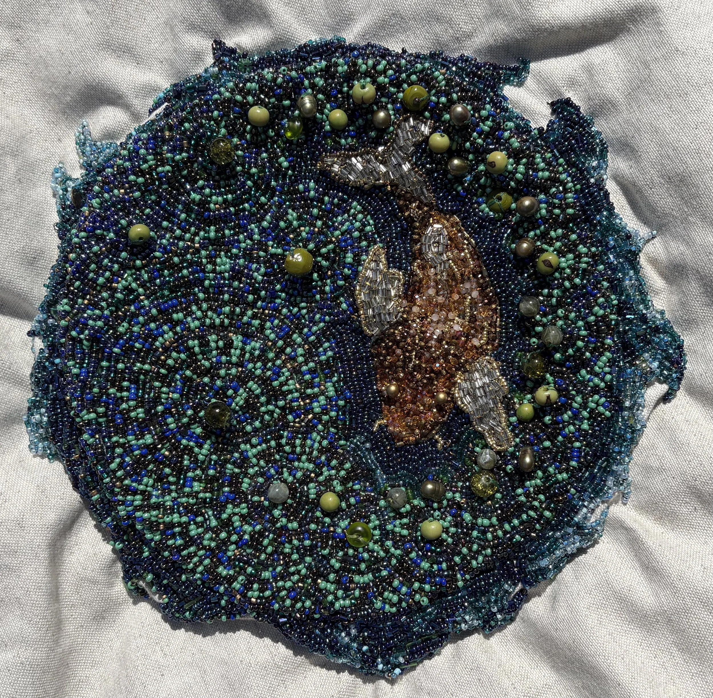 This handsewn beadwork piece is crafted from preloved and vintage necklaces that have been carefully deconstructed and brought back to life. Each bead is individually stitched to form a koi fish in graceful motion, its shimmering body flowing across the surface like water. The work transforms forgotten jewellery into a vibrant, textural artwork that reflects themes of renewal, movement, and beauty of reuse.