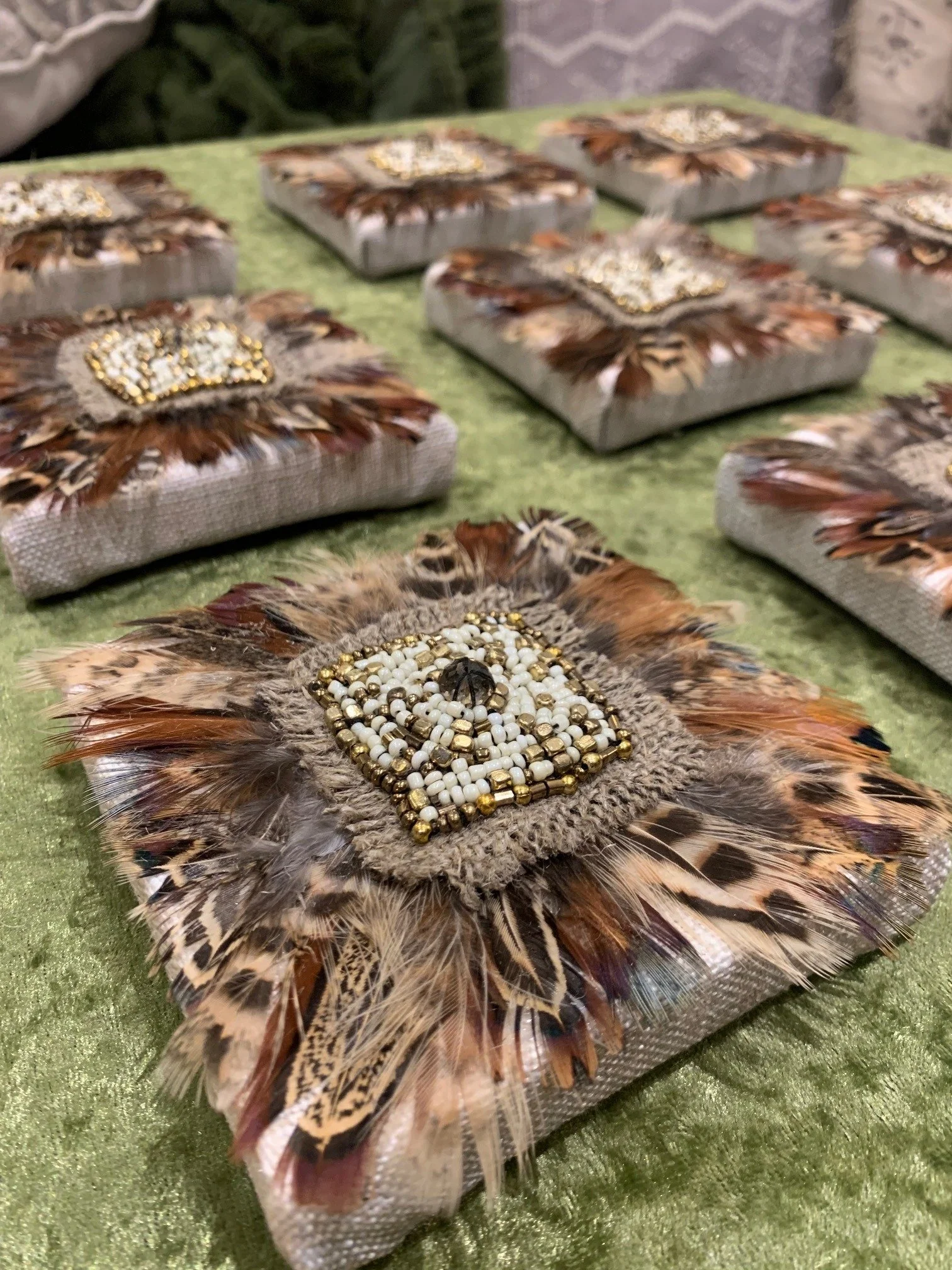 Threaded throughout the feathers is intricate, hand-sewn white and bronze beadwork, crafted from delicately sourced beads that add a refined shimmer.