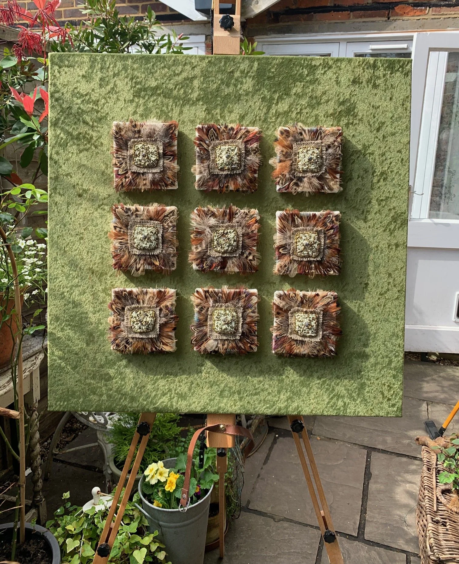 The entire composition is mounted on a backdrop of vivid green velvet, whose rich saturation and lush texture provide a striking contrast to the feathers and beadwork. The green evokes both nature and opulence - suggesting verdant landscapes, racing tradition, and the refined aesthetic associated with Goodwood, West Sussex.