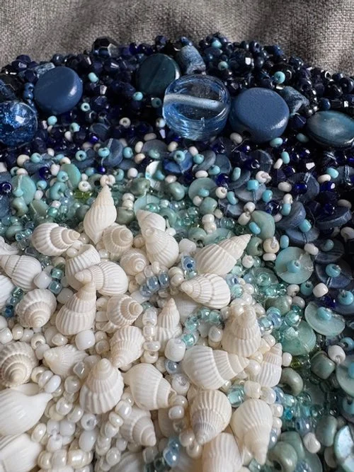 A completed beadwork centrepiece, comprising of hand-sewn dark and light blue beads, augmented with light greens and a random cluster of natural shells, evoking a coastal vibe.