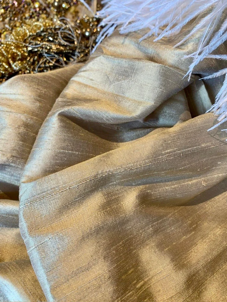 The foundation of this piece is shot champagne silk, selected for its luminous depth and tonal complexity. The silk’s interwoven hues subtly shift in changing light, giving the surface a quiet radiance and a sense of movement even at rest.
