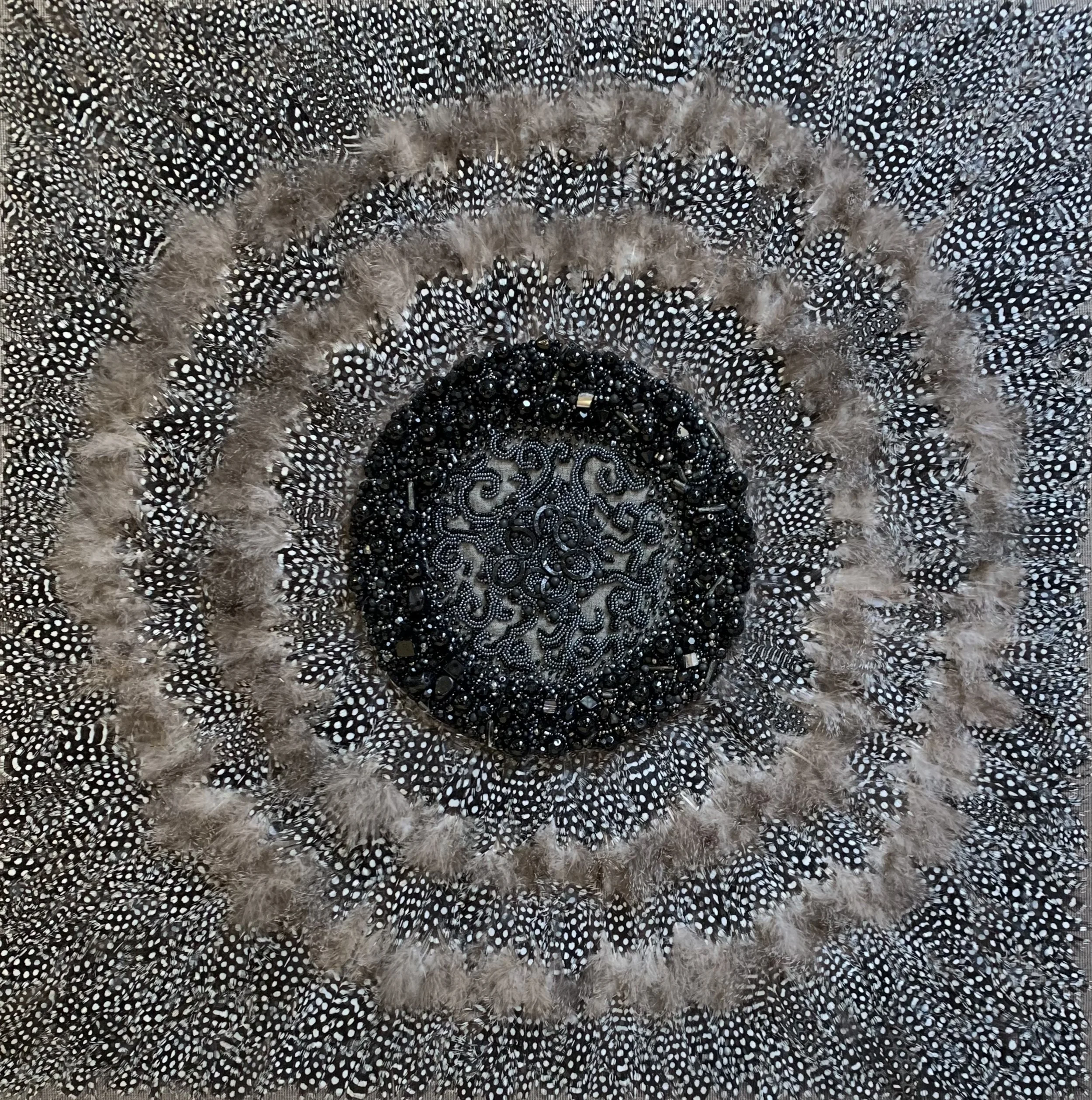 A striking piece comprising of 100s of Guinea Fowl feathers, circling a beadwork centrepiece in black and pewter, giving it a pearlescent hue.